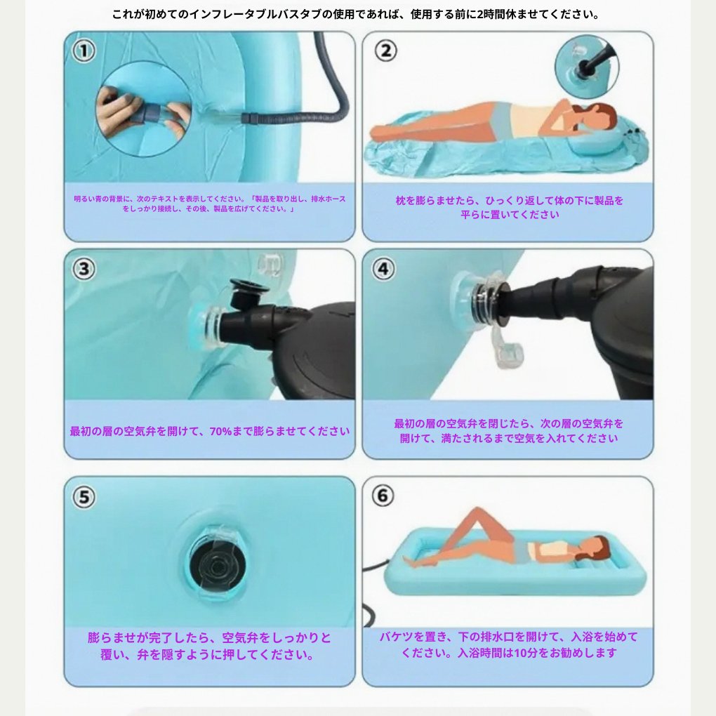 私たちのインフレータブルバスタブは、耐久性があり、安全で、簡単に清掃できる素材で作られています。特に高齢者や移動が困難な方、またはリハビリ中の方々に快適さと安全性を提供するために設計されています。入浴の瞬間に心地よさをもたらすために、すべての詳細が考慮されています。